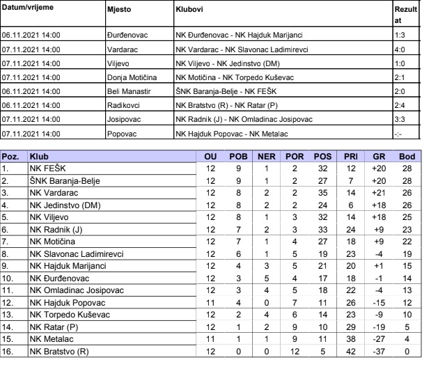 NAJNOVIJESPORT I. ŽNL Osječko-baranjska – rezultati i tablica Objavio Marko Balukčić - 8. studenoga 2021. FacebookTwitterViber foto:pixabay Za vikend su odigrane utakmice 12. kola I. ŽNL osječko-baranjske – Seniori. U nastavku teksta vam donosimo rezultate i tablicu I. ŽNL osječko-baranjske – Seniori:
