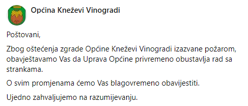 Općina Kneževi Vinogradi danas je objavila na svojoj Facebook stranici kako je zgrada Općine oštećena u požaru koji se dogodio noćaš.