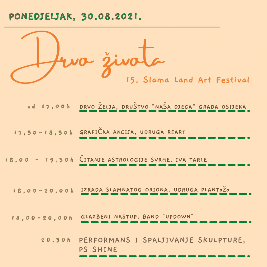 Tema ovogodišnjeg festivala jest “Drvo života”, na temelju čega je osmišljen završni multimedijalni performans (neverbalni teatar, ples, glazba) + spaljivanje središnje slamnate skulpture, planiran oko 20,30h.