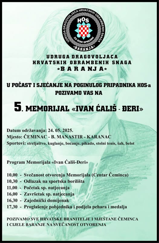 UDHOS Baranja organizira jubilarni 5. Memorijal “Ivan Ćališ-Đeri” koji će se po prvi puta održati u rodnom mjestu Đerija u Čemincu, 24. svibnja 2025. s početkom u 10 sati na Trgu ispred Doma.