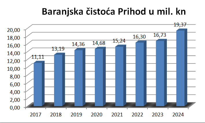 Prihodi tvrtke iznosili su 2.571.422,16 eura, što predstavlja rast od 15,74 % u odnosu na 2023. godinu, uz ostvarenu dobit od 14.084 eura. Tijekom razdoblja od 2017. do 2024. godine tvrtka bilježi kontinuirani rast prihoda s prosječnom godišnjom stopom od 17,43 %, odnosno apsolutnim povećanjem od 1.095.474,92 eura, izvijestili su iz Baranjske čistoće.