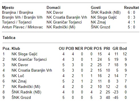 NAJNOVIJESPORT Baranjska liga – rezultati i tablica Objavio Marko Balukčić - 3. listopada 2021. FacebookTwitterViber foto:Pixabay Za vikend su odigrane utakmice 5. kola Baranjske lige. U nastavku teksta vam donosimo rezultate i tablicu Baranjske lige: