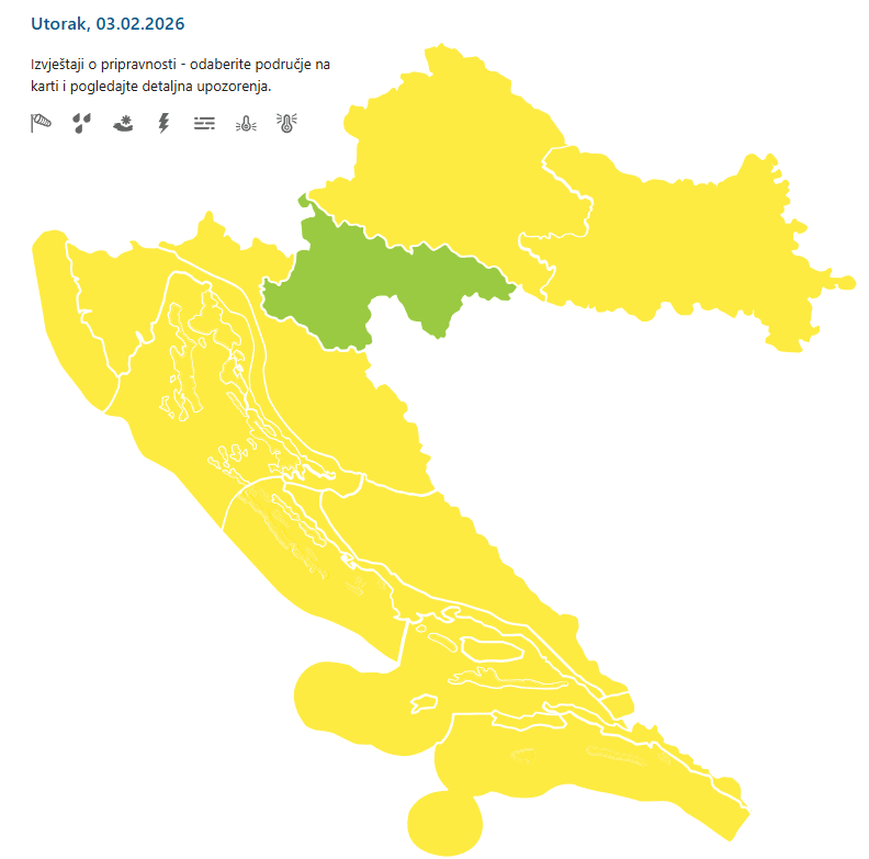 Danju većinom bez oborine, a prema večeri raste vjerojatnost za mjestimičnu kišu. Vjetar slab i umjeren jugoistočni. Najniža temperatura između -4 i -1, najviša dnevna 7 i 11 °C, prognozira DHMZ.
