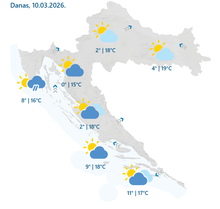 U utorak će biti pretežno sunčano vrijeme, ponegdje s umjerenom naoblakom, a ujutro lokalno s kratkotrajnom maglom, prognoza je DHMZ-a.
