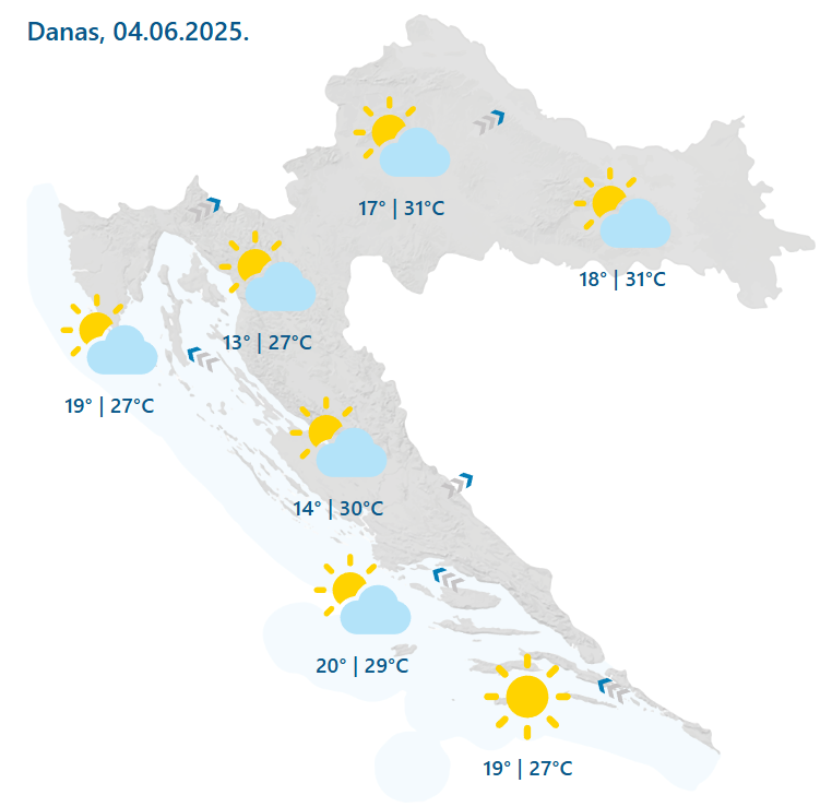 Prema prognozi DHMZ-a danas će biti pretežno sunčano, ponegdje s umjerenom naoblakom. Vjetar slab i umjeren jugozapadni, u višem gorju i jak, a na Jadranu slabo do umjereno jugo. Najviša dnevna temperatura od 27 do 32 °C, mjestimice na Jadranu te u Lici i Gorskom kotaru malo niža.