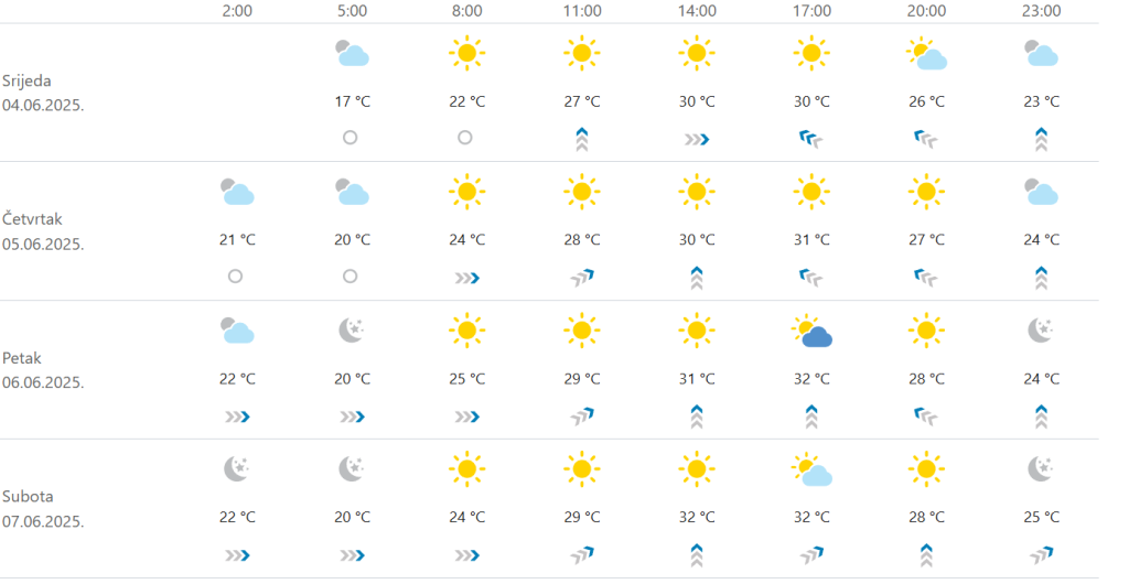 U srijedu na istoku Hrvatske pretežno sunčano, u drugom dijelu dana mjestimice uz umjerenu naoblaku. Vjetar većinom slab, mjestimice umjeren jugozapadni. Najviša dnevna temperatura između 30 i 32 °C.