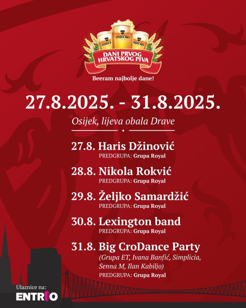 Od 27. do 31. kolovoza 2025. godine Osijek će ponovno biti domaćin jednog od najveselijih događaja ljeta – Dana prvog hrvatskog piva. Manifestacija će se održati na lijevoj obali Drave, a posjetitelje očekuje pet dana vrhunskog piva, odlične glazbe i uzavrele atmosfere pod velikim šatorom.