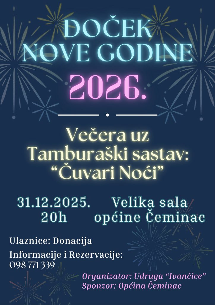 Općina Čeminac i udruga “Ivančice” pozivaju sve mještane i goste na svečani Doček Nove godine 2026., koji će se održati 31. prosinca 2025. godine s početkom u 20 sati u Velikoj sali Općine Čeminac.