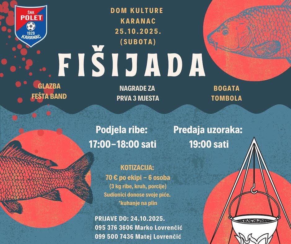 ŠNK Polet Karanac organizira tradicionalnu fišijadu koja će se održati u subotu, 25. listopada 2025. godine u Domu kulture u Karancu.
