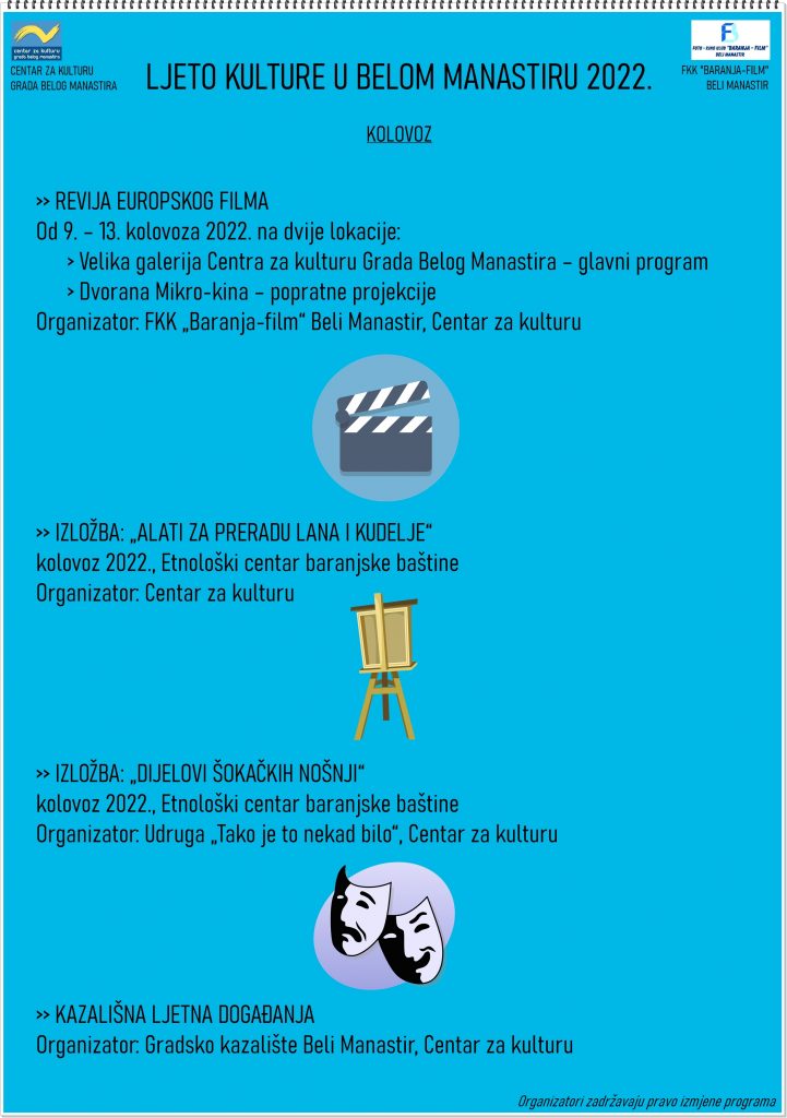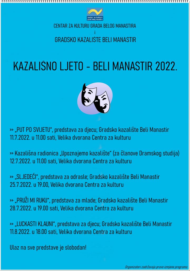 Centar za kulturu Grada Belog Manastira u suradnji s Gradskim kazalištem Beli Manastir i FKK ”Baranja film” Beli Manastir organizira Kazališno ljeto i Ljeto kulture.