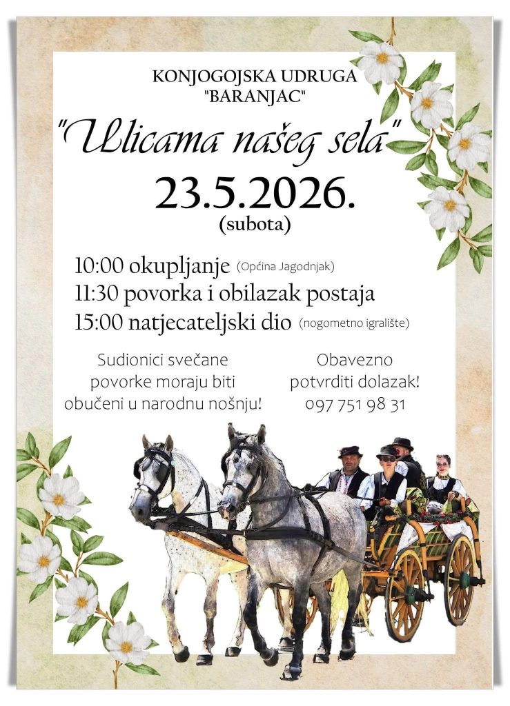 Konjogojska udruga „Baranjac“ organizira tradicionalnu manifestaciju „Ulicama našeg sela“ koja će se održati u subotu, 23. svibnja 2026. godine na području Općine Jagodnjak, uz bogat program i sudjelovanje ljubitelja konja, tradicije i običaja.