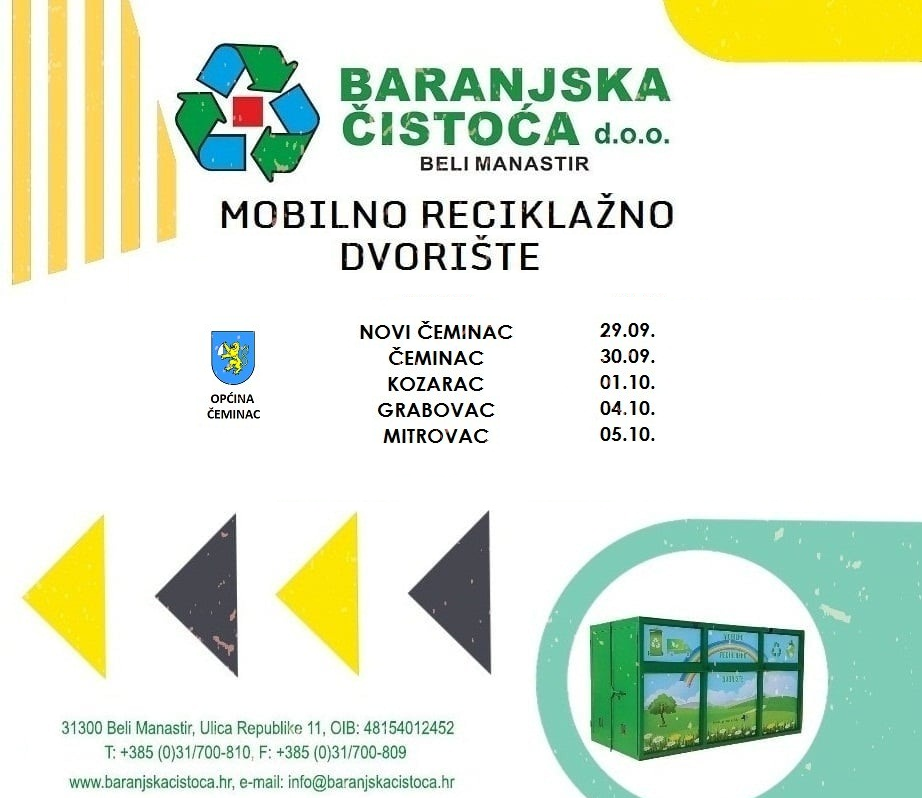 Mobilno reciklažno dvorište Baranjske čistoće se od danas (29. rujna) nalazi na području općine Čeminac. Radno vrijeme je od 08:00 do 13:00 sati.