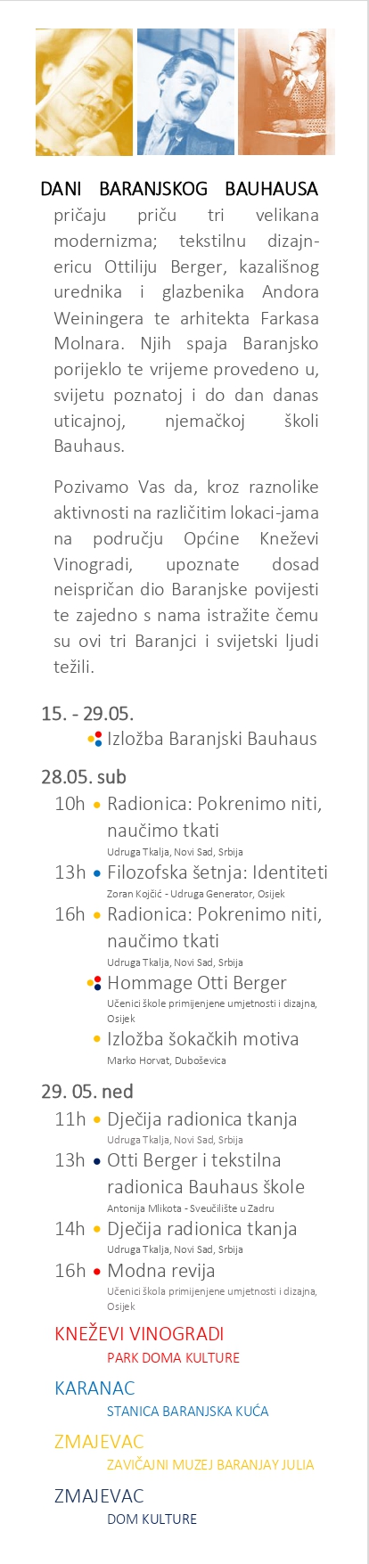 Na samoj višerazinskoj manifestaciji će se održati i izložba panela baranjskih bauhaus velikana na otvorenom, radovi i modna revija Škole primijenjene umjetnosti i dizajna Osijek, radionice tkanja Udruge Tkalja Novi Sad, predavanje o Ottiliji i njenom djelu koje će prezentirati izvanredna profesorica Sveučilišta u Zadru, povjesničarka umjetnosti Antonije Mlikote, filozofska šetnja kroz Karanac koju vodi autor Željko Kojčić iz Udruge Generator te diječiji i glazbeni sadržaji na različitim lokacijama unutar općine Kneževi Vinogradi.