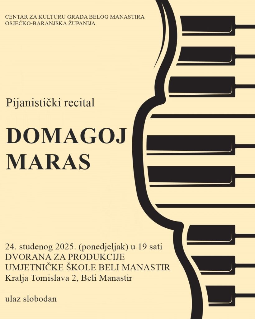 Centar za kulturu Grada Belog Manastira uz podršku Osječko – baranjske županije organizira koncert Domagoja Marasa (klavir) u Umjetničkoj školi Beli Manastir u ponedjeljak, 24. studenog u 19 sati.