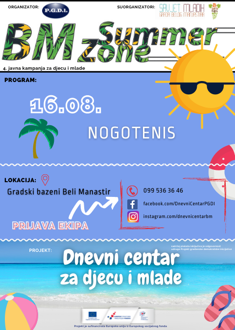 U sklopu 4. javne kampanje Dnevnog centra za djecu i mlade, udruga Projekt građanske demokratske inicijative u suradnji sa Savjetom mladih Grada Belog Manastira i Turističkom zajednicom Baranje organizira BM Summer Zone!