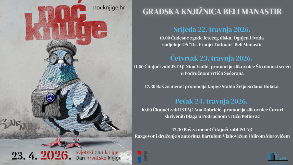 Gradska knjižnica Beli Manastir poziva sve da nam se pridruže u večernjim satima i pridonesu stvaranju još jedne nezaboravne Noći knjige.