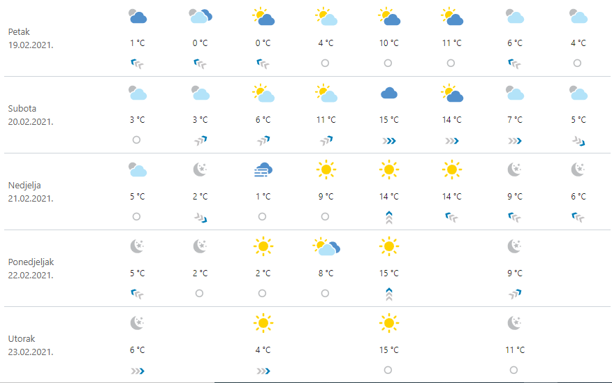 Kraj radnog tjedna, četvrtak i petak, temperature će se kretati do 10 °C tijekom dana, a tijekom noći par stupnjeva iznad nule.