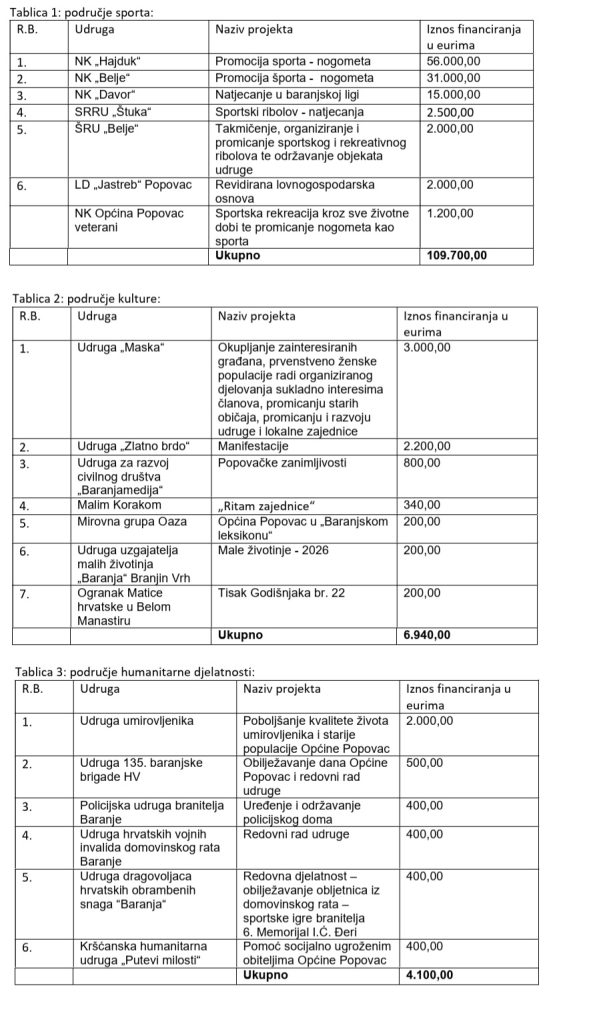 Krajem siječnja raspisan je natječaj za financiranje projekata udruga na području Općine Popovac. Na natječaj su pristigle prijave udruga iz različitih područja djelovanja – sporta, kulture i područja humanitarnih djelatnosti.