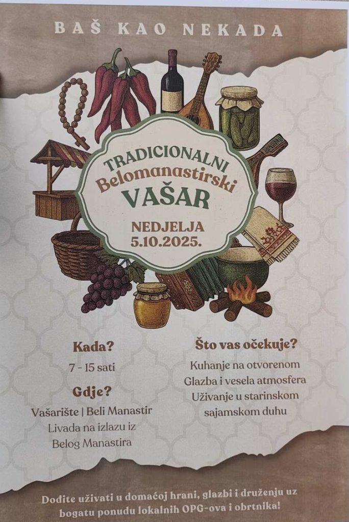 U nedjelju, 5. listopada 2025., u Belom Manastiru održat će se Tradicionalni belomanastirski vašar pod motom „Baš kao nekada“.