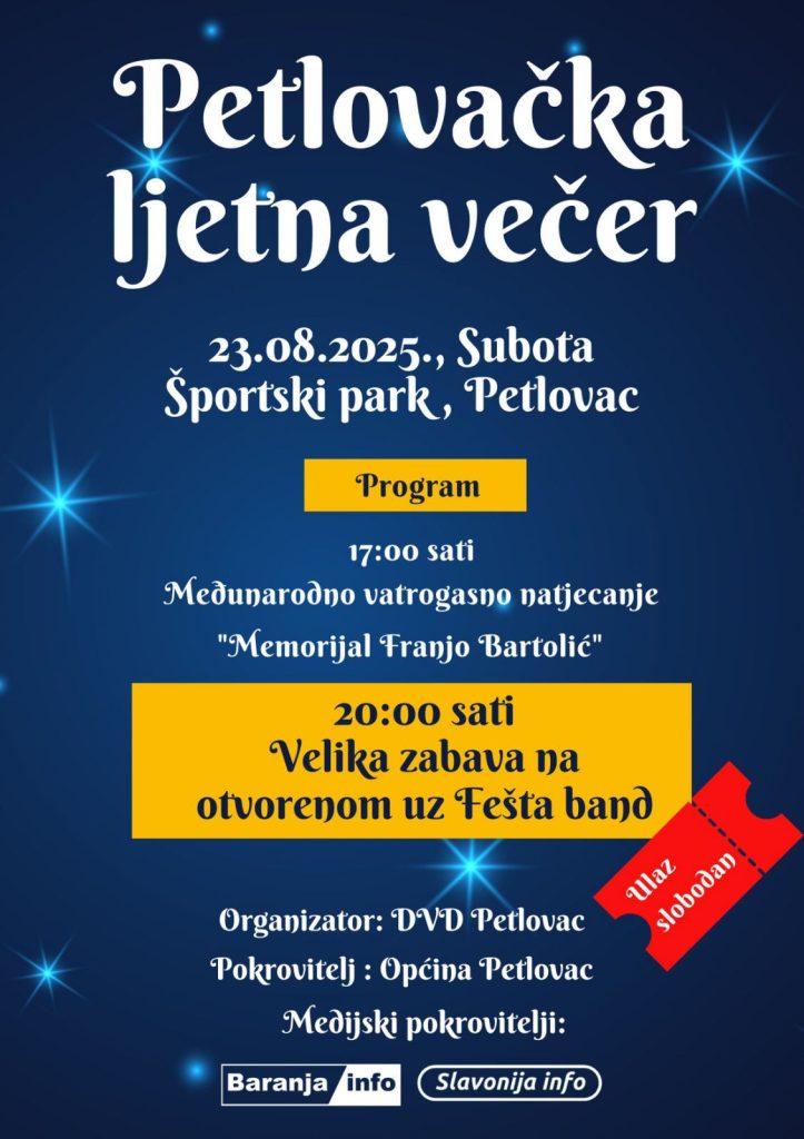 DVD Petlovac organizira Petlovačku ljetnu večer 23. kolovoza u Sportskom parku u Petlovcu. Ulaz je besplatan za sve.