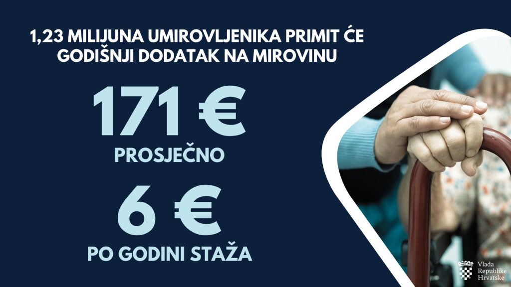 Godišnji dodatak za 1,23 milijuna umirovljenika u 2025. godini iznositi šest eura po godini staža
