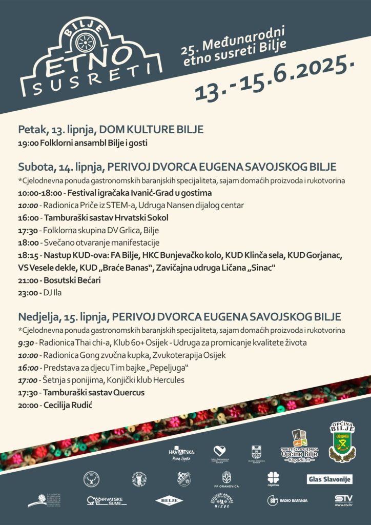 U Bilju će se od 13. do 15. lipnja održati 25. Međunarodni etno susreti. Trodevni program obuhvaća folklorne nastupe, koncerte, radionice za djecu i odrasle, sajam rukotvorina te nezaboravne baranjske specijalitete.