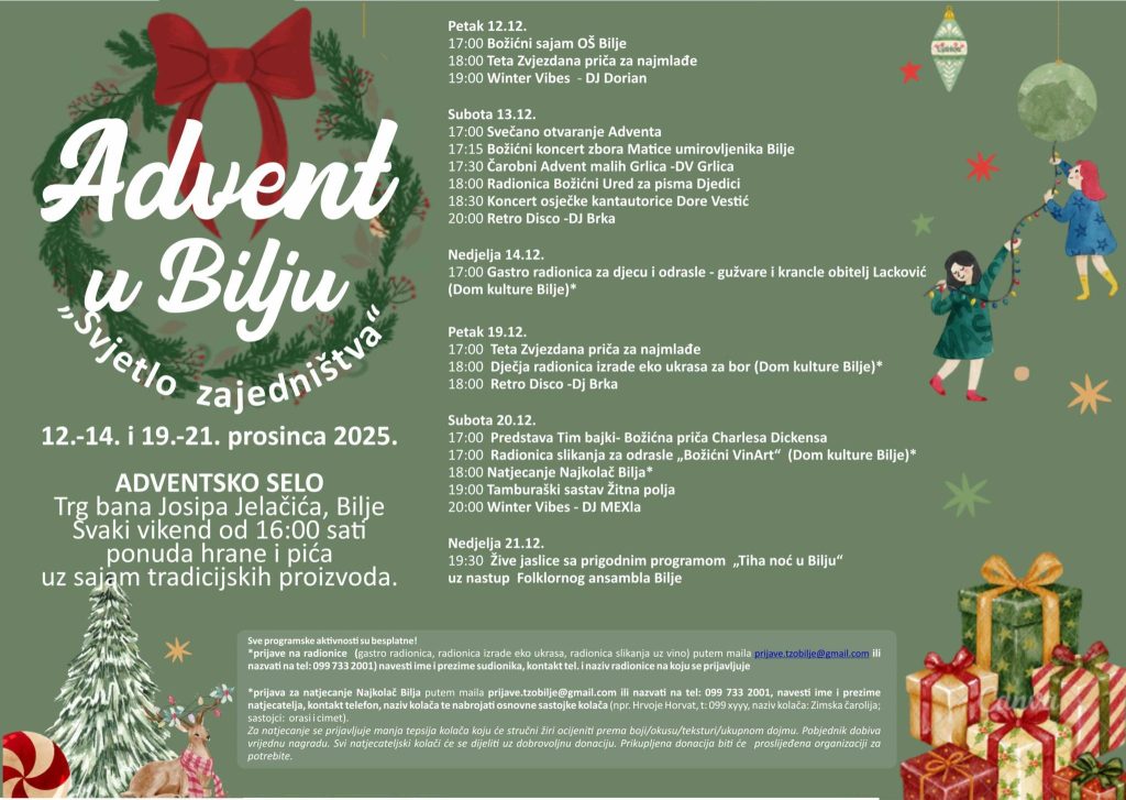 Bilje i ove godine priprema posebno blagdansko iskustvo za svoje mještane i posjetitelje. Program adventa će se održati tijekom dva vikenda u prosincu, od 12. do 14. prosinca te od 19. do 21. prosinca.