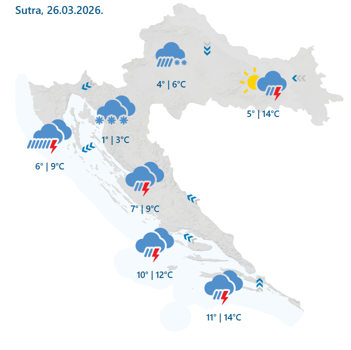 U četvrtak stiže nestabilno, vjetrovito i osjetno hladnije vrijeme, osobito na kopnu. Prema prognozi Državnog hidrometerološkog zavoda u unutrašnjosti će kiša mjestimice prelaziti u susnježicu, ponajprije u gorju i snijeg, u Gorskoj Hrvatskoj uz stvaranje debljeg snježnog pokrivača. Pretežno oblačno, povremeno kiša i pljuskovi s grmljavinom, osobito na Jadranu, lokalno i obilna oborina. Puhat će umjeren i jak sjeverni i sjeveroistočni vjetar, na udare i olujan, na istoku i istočni.