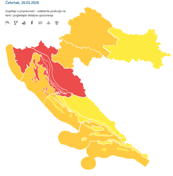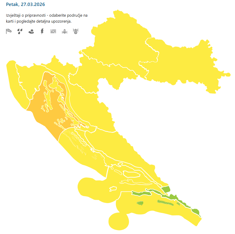 “Jak, na udare i olujan sjeverni i sjeverozapadni vjetar. Najjači udari vjetra > 65 km/h. Budite na oprezu zbog krhotina koje lete nošene jakim vjetrom. Mogući su lokalizirani prekidi u aktivnostima na otvorenom.”, upozorava DHMZ.