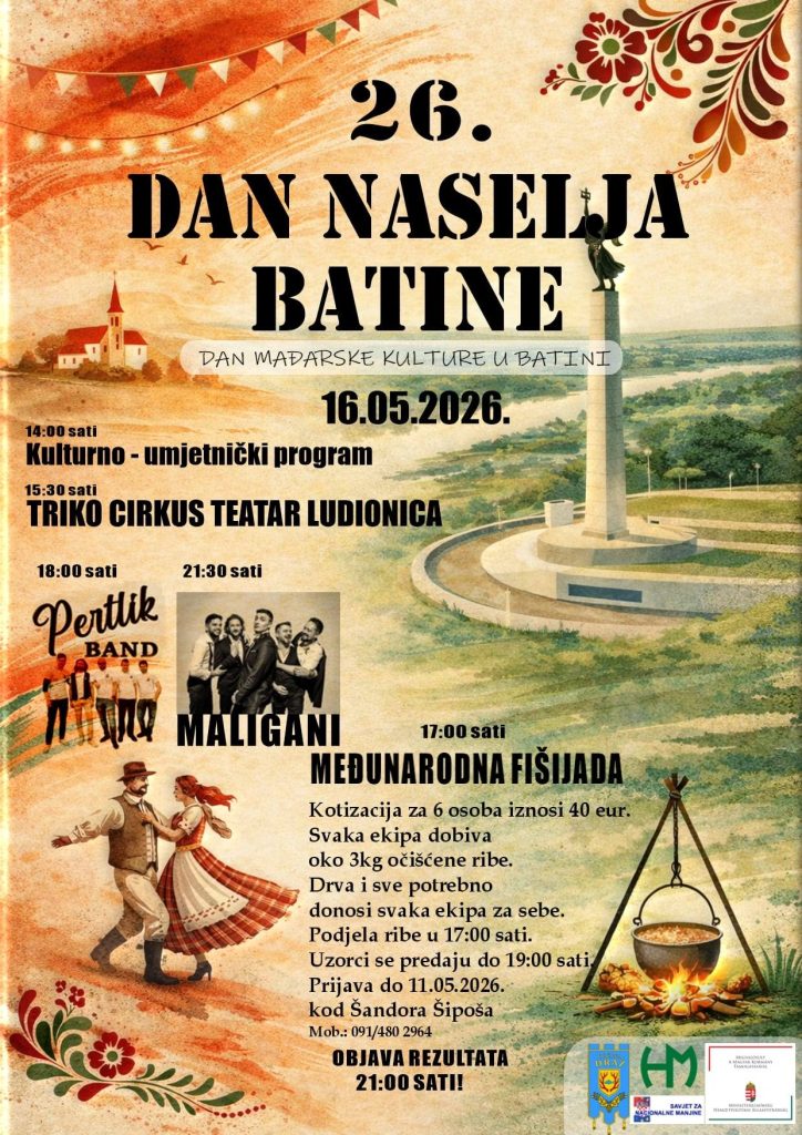 Dan naselja Batine i Dan mađarske kulture u Batini obilježit će se u subotu, 16. svibnja 2026. godine uz međunarodnu fišijadu na Zelenom otoku