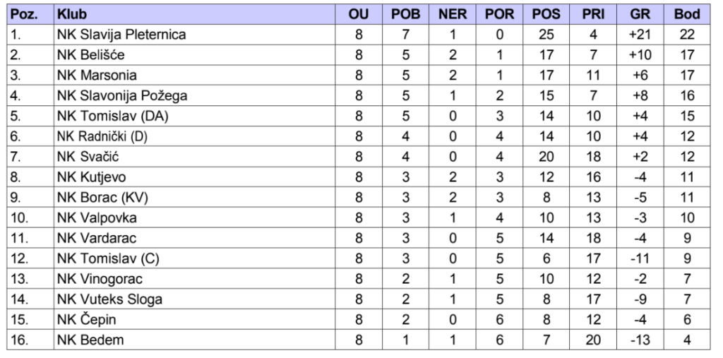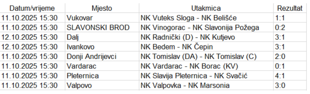 NAJNOVIJESPORT Treća NL Istok – rezultati i tablica Objavio Mateja Francuz - 13. listopada 2025. FacebookTwitterViber foto: Pixabay Za vikend su odigrane utakmice 8. kola Treće NL Istok U nastavku teksta vam donosimo rezultate i tablicu Treće HNL Istok– Seniori: