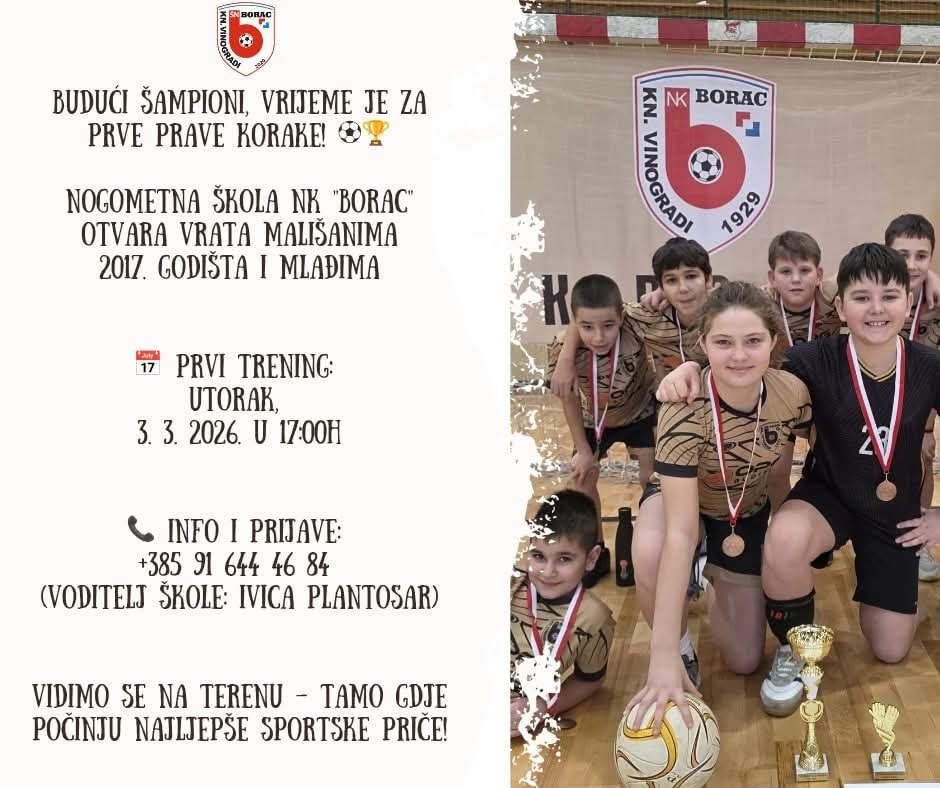 Nogometni klub Borac Kneževi Vinogradi poziva sve dječake i djevojčice da se pridruže školi nogometa.