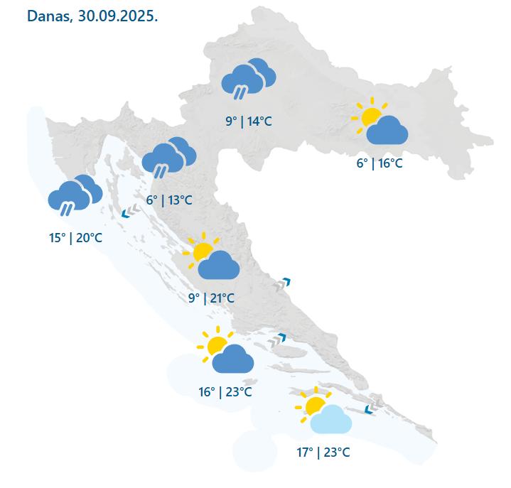 Prema prognozi Državnog hidrometerološkog zavoda danas će u unutrašnjosti i na sjevernom Jadranu biti umjereno do pretežno oblačno, ponegdje uz malo kiše. U Dalmaciji pretežno sunčano, od sredine dana sa sjevera porast naoblake. Vjetar većinom slab, na Jadranu mjestimice umjerena bura, poslijepodne na srednjem i južnom dijelu jugozapadnjak. Najviša dnevna temperatura između 11 i 16, na Jadranu i u unutrašnjosti Dalmacije od 19 do 24 °C.