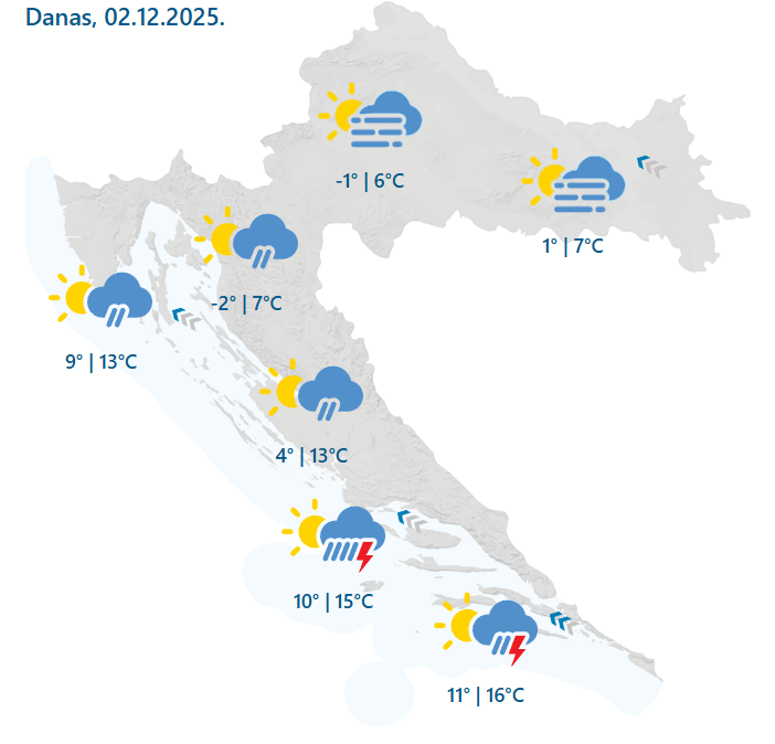 Prema prognozi DHMZ-a danas će biti promjenljivo oblačno vrijeme. Ujutro u unutrašnjosti mjestimice magla. Na Jadranu i uz njega povremeno s kišom, a u Dalmaciji su lokalno mogući pljuskovi s grmljavinom. Prema večeri kiše može biti i na sjeveru unutrašnjosti.