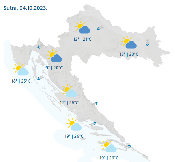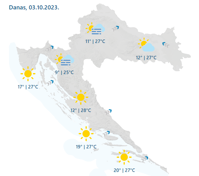 Najniža jutarnja temperatura od 8 do 13, na Jadranu od 16 do 20 °C. Najviša dnevna temperatura od 19 do 24 na kopnu i od 24 do 27 °C na moru, podaci su DHMZ-a.