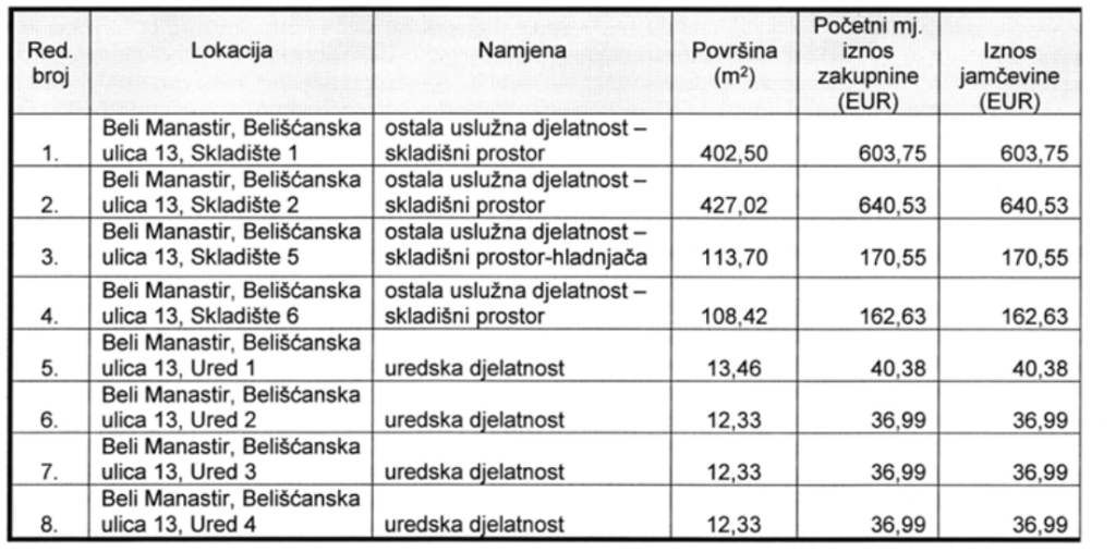 U zakup se daju poslovni prostori u zgradi skladišnih kapaciteta u Belom Manastiru, Belišćanska ulica 13 s početnom mjesečnom zakupninom: